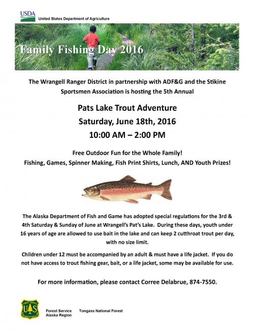 The Alaska Department of Fish and Game has adopted special regulations for the 3rd & 4th Saturday & Sunday of June at Wrangell’s Pat’s Lake. During these days, youth under 16 years of age are allowed to use bait in the lake and can keep 2 cutthroat trout per day, with no size limit.